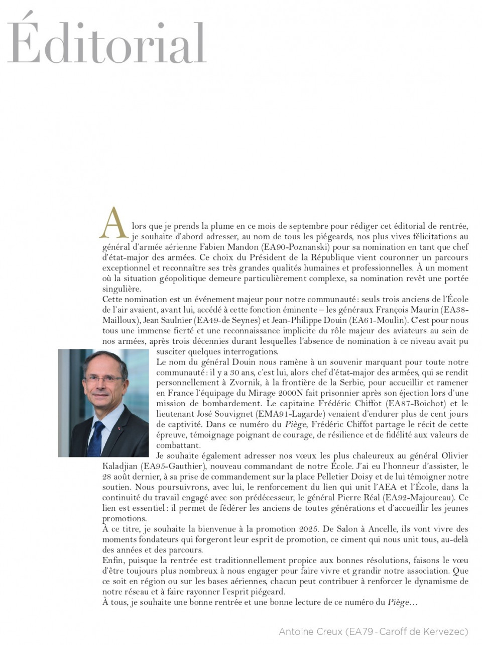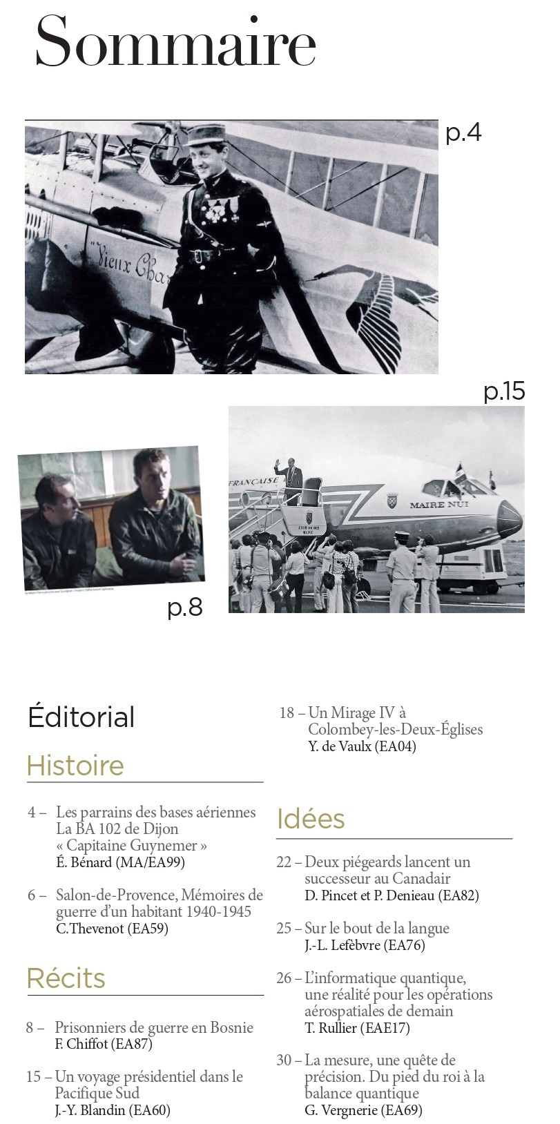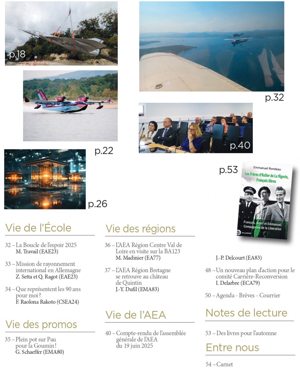 Au fil de ses pages, vous trouverez de quoi réchauffer vos moteurs : récits historiques pour les nostalgiques du tarmac, réflexions neuves pour les esprits en ascension, et nouvelles fraîches de l’École, des promotions, des régions et de l'AEA.