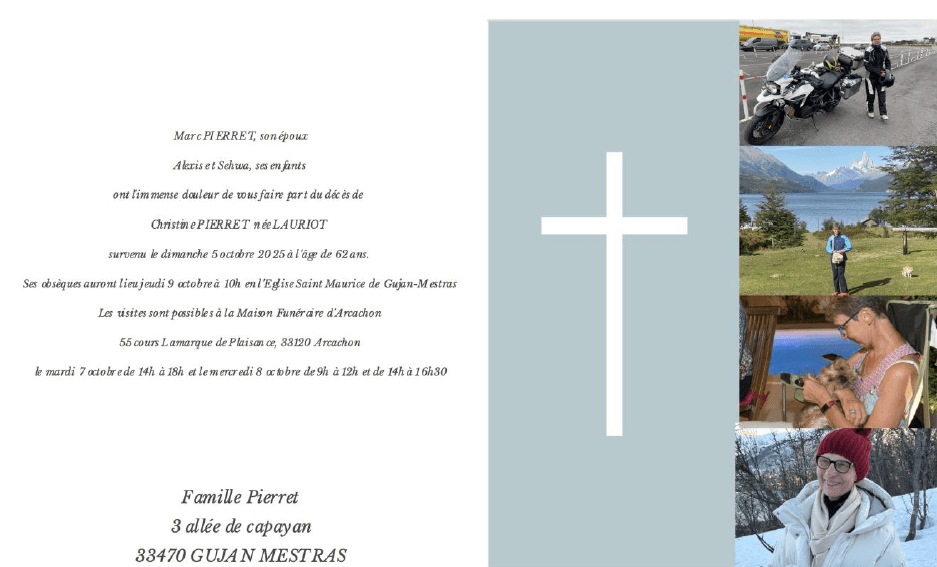 Suite au décès de notre camarade Christine Pierret ce 05 octobre, la promotion EMA87-Lempereur ouvre une cagnotte sur notre site. Les fonds serviront notamment à l'achat d'une gerbe de fleurs et à la réalisation d'un album souvenir qui sera remis ultérieurement à sa famille.