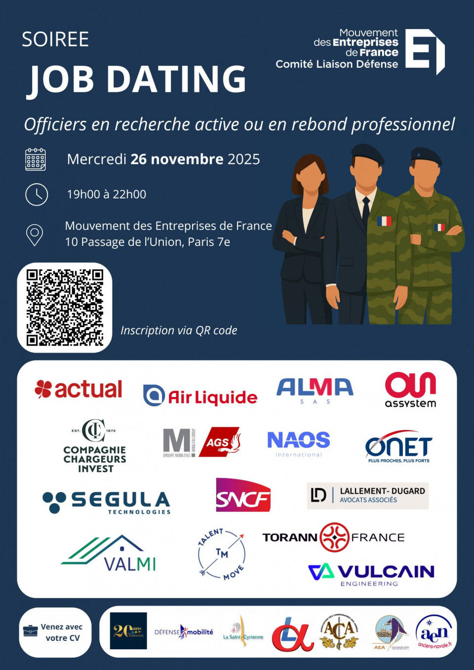 Dans la continuité de l’action du MEDEF pour la reconversion des officiers et de la mise en œuvre du manifeste ProMilès, le Comité Liaison Défense du MEDEF organise une soirée « Rencontres avec les entreprises » au siège du Mouvement des entreprises de France (l’accès se fait désormais par le 10 passage de l’Union – 75007 Paris), le mercredi 26 novembre 2025 de 19h00 à 22h00. Il est recommandé d'arriver vers 18h45 pour permettre le début à 19h00 précises. Une douzaine d’entreprises (liste en cours d’élaboration) sera associée à cet événement organisé au profit d'officiers et d'anciens officiers en recherche active. Nous attendons une cinquantaine de participants pour certains étant en cours de projet de reconversion ou ayant déjà des projets finalisés, d’autres abordant un deuxième rebond professionnel. Ils sont généralement tous ouverts à la mobilité.