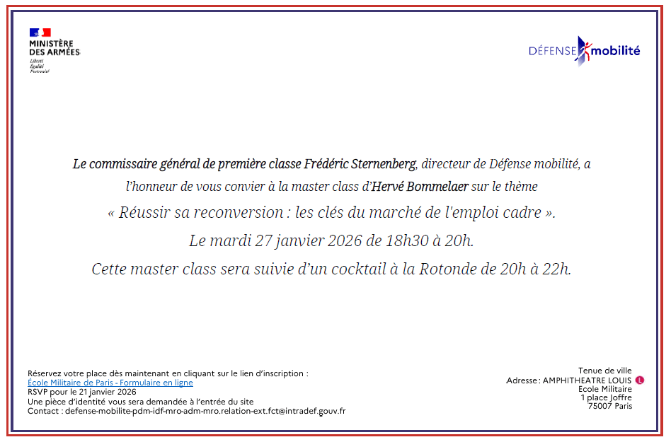 La Mission de reconversion des officiers a le plaisir de vous inviter à la "master class" animée par Hervé Bommelaer, qui se tiendra le mardi 27 janvier 2026, de 18h30 à 20h, à l’École militaire, et sera également accessible à distance en visioconférence.